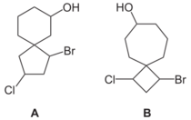 Nomenclature for spiro compounds was first discussed by Adolf von Baeyer in 1900.[10] The prefix spiro denotes two rings with a spiro junction. The main method of systematic nomenclature is to follow with square brackets containing the number of atoms in the smaller ring then the number of atoms in the larger ring, separated by a period, in each case excluding the spiroatom (the atom by which the two rings are bonded) itself. Position-numbering starts with an atom of the smaller ring adjacent to the spiroatom around the atoms of that ring, then the spiroatom itself, then around the atoms of the larger ring.[11] For example, compound A in the image is called 1-bromo-3-chlorospiro[4.5]decan-7-ol, and compound B is called 1-bromo-3-chlorospiro[3.6]decan-7-ol.