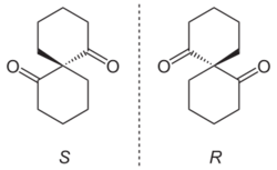 Spiranes can be chiral, in three distinct ways.[6]:1138ff First, while nevertheless appearing to be twisted, they yet may have a chiral center making them analogous to any simple chiral compound, and second, while again appearing twisted, the specific location of substituents, as with alkylidenecycloalkanes, may make a spiro compound display central chirality (rather than axial chirality resulting from the twist); third, the substituents of the rings of the spiro compound may be such that the only reason they are chiral arises solely from the twist of their rings, e.g., in the simplest bicyclic case, where two structurally identical rings are attached via their spiro atom, resulting in a twisted presentation of the two rings.[6]:1138ff,1119ff[4]:319f.846f Hence, in the third case, the lack of planarity described above gives rise to what is termed axial chirality in otherwise identical isomeric pair of spiro compounds, because they differ only in the right- versus left-handed "twist" of structurally identical rings (as seen in allenes, sterically hindered biaryls, and alkylidenecycloalkanes as well).[6]:1119f Assignment of absolute configuration of spiro compounds has been challenging, but a number of each type have been unequivocally assigned.[6]:1139ff