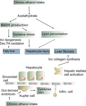 Alcoholic hepatitis is characterized by the inflammation of hepatocytes. Between 10% and 35% of heavy drinkers develop alcoholic hepatitis (NIAAA, 1993). While development of hepatitis is not directly related to the dose of alcohol, some people seem more prone to this reaction than others. This is called alcoholic steato-necrosis and the inflammation appears to predispose to liver fibrosis. Inflammatory cytokines (TNF-alpha, IL-6 and IL-8) are thought to be essential in the initiation and perpetuation of liver injury and cytotoxic hepatomegaly by inducing apoptosis and severe hepatotoxicity. One possible mechanism for the increased activity of TNF-α is the increased intestinal permeability due to liver disease. This facilitates the absorption of the gut-produced endotoxin into the portal circulation. The Kupffer cells of the liver then phagocytose endotoxin, stimulating the release of TNF-α. TNF-α then triggers apoptotic pathways through the activation of caspases, resulting in cell death.[4]