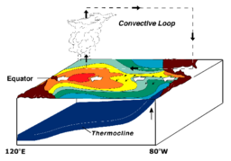 El Niño-Southern Oscillation (ENSO; commonly referred to as simply El Niño) is a global coupled ocean-atmosphere phenomenon. The Pacific Ocean signatures, El Niño and La Niña are important temperature fluctuations in surface waters of the tropical Eastern Pacific Ocean. The name El Niño, from the Spanish for "the little boy," refers to the Christ child, because the phenomenon is usually noticed around Christmas time in the Pacific Ocean off the west coast of South America.[1] La Niña, similarly, means "the little girl." These effects were first described in 1923 by Sir Gilbert Thomas Walker from whom the Walker circulation, an important aspect of the Pacific ENSO phenomenon, takes its name.