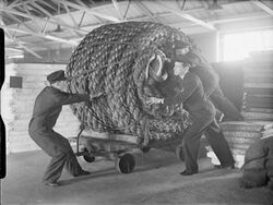 Supply ratings handling a coil of 16 inches (410 mm) towing hawser (rope) at the Royal Navy's Naval Stores Department, Nore, Harwich, which supplies all sea-going ships with the stores and provisions that they need. Note that the coil is bigger than the men and they need a trolley to transport it.