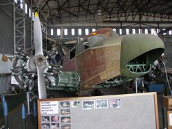 It was normally operated by a three-man crew; the seating arrangement could be altered in order to suit various purposes, such as to better enable a specific training role. The cockpit was outfitted with dual flying controls and a pair of seats, intended to accommodate a pilot and either a navigator or second pilot alongside. When used for bomb aimer training, the second set of controls would be removed and the freed-up space was instead used to accommodate a prone bomb-aimer.[8] When used as a navigation trainer, the second seat was pushed back so that it would line up with the chart table.[10] Aft of the cockpit was a wireless operator station, facing aft on the starboard side of the fuselage. On the Oxford I, a dorsal turret was located amidships; it could be used for training navigators, bomb-aimers, wireless operators, air gunners and camera operators.[8] The centre section can contain up to 16 11 lb. practice bombs, which are controlled via bomb-release switches installed at the pilot and bomb-aimers' stations.[11]