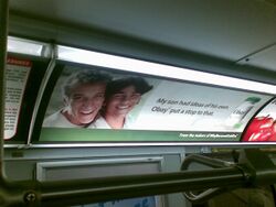 Beginning the week of February 11, 2008, advertisements for Obay began appearing throughout Ontario, primarily at public transit venues such bus stops, subway stations, as well as on and in transit vehicles themselves. The ads variously claimed that Obay, "from the makers of WhyBecauseISaidSo™", could stop children from thinking for themselves, or supplant their own hopes and goals with their parents'.[4] Radio ads also aired directing listeners to call 1-888-YOU-OBAY, where Obay was said to transform children into "docile pussycats, open to... the future you've mapped out for them."[5] The campaign received national and international attention.[6][7]