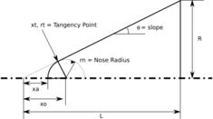 In practical applications such as re-entry vehicles, a conical nose is often blunted by capping it with a segment of a sphere. The tangency point where the sphere meets the cone can be found from: