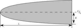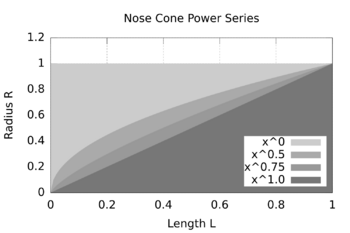 In all of the following nose cone shape equations, L is the overall length of the nose cone and R is the radius of the base of the nose cone. y is the radius at any point x, as x varies from 0, at the tip of the nose cone, to L. The equations define the two-dimensional profile of the nose shape. The full body of revolution of the nose cone is formed by rotating the profile around the centerline C⁄L. While the equations describe the 'perfect' shape, practical nose cones are often blunted or truncated for manufacturing, aerodynamic, or thermodynamic reasons.[1]