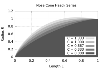 Unlike all of the nose cone shapes above, Wolfgang Haack's series shapes are not constructed from geometric figures. The shapes are instead mathematically derived for the purpose of minimizing drag; a related shape with similar derivation being the Sears–Haack body. While the series is a continuous set of shapes determined by the value of C in the equations below, two values of C have particular significance: when C = 0, the notation LD signifies minimum drag for the given length and diameter, and when C = 1/3, LV indicates minimum drag for a given length and volume. The Haack series nose cones are not perfectly tangent to the body at their base except for the case where C = 2/3. However, the discontinuity is usually so slight as to be imperceptible. For C > 2/3, Haack nose cones bulge to a maximum diameter greater than the base diameter. Haack nose tips do not come to a sharp point, but are slightly rounded.