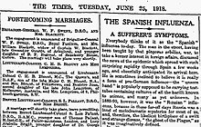 Outside Spain, the disease was soon misnamed 'Spanish influenza'.[45][46] In a 2 June 1918 The Times of London dispatch titled, "The Spanish Epidemic," a correspondent in Madrid reported over 100,000 victims of, "The unknown disease…clearly of a gripal character," without referring to "Spanish influenza" directly.[47] Three weeks later The Times reported that, "Everybody thinks of it as the 'Spanish' influenza to-day."[48] Three days after that an advertisement appeared in The Times for Formamint tablets to prevent "Spanish influenza".[49][50] When it reached Moscow, Pravda announced, "Ispánka (the Spanish lady) is in town," making 'the Spanish lady' another common name.[51]