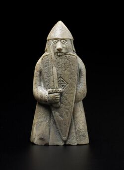 Hnefatafl was probably the oldest type of board game played in medieval Scandinavia.[225] The archaeological record indicates that hnefatafl was popular by the early medieval period, with the Vikings introducing it to England, Scotland, Wales, and Ireland.[232] The Ockelbo Runestone shows two men possibly playing hnefatafl,[233] and one saga suggests that dice games involved gambling.[230]
