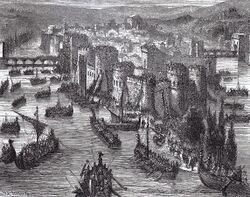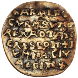 As early as 839, when Swedish emissaries are first known to have visited Byzantium, Scandinavians served as mercenaries in the service of the Byzantine Empire.[76] In the late 10th century, a new unit of the imperial bodyguard formed. Traditionally containing large numbers of Scandinavians, it was known as the Varangian Guard. The word Varangian may have originated in Old Norse, but in Slavic and Greek it could refer either to Scandinavians or Franks. In these years, Swedish men left to enlist in the Byzantine Varangian Guard in such numbers that a medieval Swedish law, the Västgötalagen, from Västergötland declared no-one could inherit while staying in "Greece"—the then Scandinavian term for the Byzantine Empire—to stop the emigration,[77] especially as two other European courts simultaneously also recruited Scandinavians:[78] Kievan Rus' c. 980–1060 and London 1018–1066 (the Þingalið).[78]