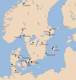 By the late 11th century, royal dynasties were legitimised by the Catholic Church (which had had little influence in Scandinavia 300 years earlier) which were asserting their power with increasing authority and ambition, with the three kingdoms of Denmark, Norway, and Sweden taking shape. Towns appeared that functioned as secular and ecclesiastical administrative centres and market sites, and monetary economies began to emerge based on English and German models.[122] By this time the influx of Islamic silver from the East had been absent for more than a century, and the flow of English silver had come to an end in the mid-11th century.[123]