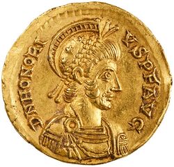 Honorius, the younger son of Theodosius I, was declared Augustus (and as such co-emperor with his father) on 23 January in 393, at the age of 9. Upon the death of Theodosius, Honorius inherited the throne of the West at the age of ten whilst his older brother Arcadius inherited the East. The western capital was initially Mediolanum, as it had been during previous divisions, but it was moved to Ravenna in 401 upon the entry of the Visigothic king Alaric I into Italy. Ravenna, protected by abundant marshes and strong fortifications, was far easier to defend and had easy access to the imperial fleet of the Eastern Empire but made it more difficult for the Roman military to defend the central parts of Italy from regular barbarian incursions.[54] Ravenna would remain the western capital until 450 when Valentinian III moved the court back to Rome. Most western emperors from 450 until 475 reigned from Rome. The last de facto western emperor Romulus Augustulus resided in Ravenna from 475 until his deposition in 476 and Ravenna would later be the capital of both the Ostrogothic Kingdom and the Exarchate of Ravenna.[55][56]