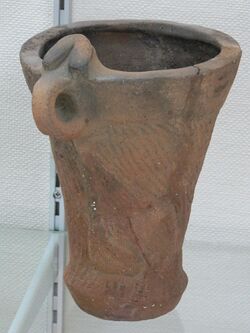 The Idojiri site was excavated numerous times from 1949 onwards. It was found to contain the foundations for over 200 pit dwellings along with an enormous amount Jōmon pottery shards which have been used in establishing an earthenware chronology of the period, including twelve complete pottery containers with a distinctive design of abstract patterns, people, and the heads of animals. Nine of these pots were large, deep containers suitable for use as storage containers. The others appear to have been used for boiling food. Artifacts uncovered at the site include a large number of stone tools, including ten concave stones, 54 stone axes and stone dishes, which are believed to have been used for cooking and for processing of nuts and acorns. The site also contained carbonized remains from the hearths, which appear to be the remnants of burned bread.[2]