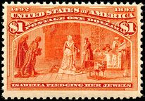There are several candidates for the title of the first commemorative. A 17-cent stamp issued in 1860 by New Brunswick, showing the Prince of Wales in anticipation of his visit is one possibility.[3] Often cited as the world's first commemoratives are the sixteen stamps of the United States Columbian Issue, produced to celebrate the World Columbian Exposition in Chicago honoring the 400th anniversary of Christopher Columbus's arrival in the New World in 1492. (Illustrated here is the $1 stamp from the series: "Isabella pledging her jewels.")[1][4]