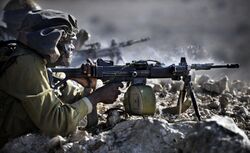 The Negev is a gas-operated, air-cooled, open bolt, select-fire, light machine gun (LMG) with a rotating bolt. The Negev uses a long-stroke gas piston system that runs under the barrel and is connected directly to the bolt carrier, the gas system comes with a three position gas regulator for use with different feed types and conditions.[6] The design was meant to be reliable, especially in adverse conditions.[7] It was officially adopted by the Israeli Defense Forces in 1997 (IDF).