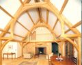 A bent in a finished timber frame home in the form of a hammerbeam truss.