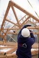 A worker directs the crane operator with hand signals as a bent is flown into place [photo reversed]