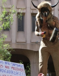 Climate activist Jake Angeli at the Arizona Climate March in 2019. Angeli, also known as "Buffalo man", "Viking man", and "QAnon shaman", led the occupation of the U.S. Capitol building in 2021.[12]