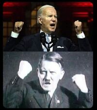 Comparison of an angry Joe Biden and an angry Adolf Hitler engaging in demagogic gesturing during a speech.