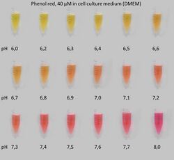 Most living tissues prosper at a near-neutral pH—that is, a pH close to 7. The pH of blood ranges from 7.35 to 7.45, for instance. When cells are grown in tissue culture, the medium in which they grow is held close to this physiological pH. A small amount of phenol red added to this growth medium will have a pink-red color under normal conditions. Typically, 15 mg/L are used for cell culture.