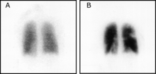 A ventilation/perfusion scan (or V/Q scan or lung scintigraphy) shows that some areas of the lung are being ventilated but not perfused with blood (due to obstruction by a clot).[17] This type of examination is as accurate as multislice CT, but is less used, due to the greater availability of CT technology. It is particularly useful in people who have an allergy to iodinated contrast, impaired kidney function, or are pregnant (due to its lower radiation exposure as compared to CT).[56][57][58] The test can be performed with planar two-dimensional imaging, or single photon emission tomography (SPECT) which enables three-dimensional imaging.[49] Hybrid devices combining SPECT and CT (SPECT/CT) further enable anatomic characterization of any abnormality.