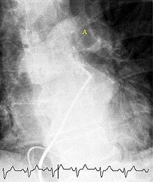 Selective pulmonary angiogram revealing clot (labeled A) causing a central obstruction in the left main pulmonary artery. ECG tracing shown at bottom.