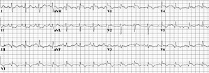 The primary use of the ECG is to rule out other causes of chest pain.[61] An electrocardiogram (ECG) is routinely done on people with chest pain to quickly diagnose myocardial infarctions (heart attacks), an important differential diagnosis in an individual with chest pain. While certain ECG changes may occur with PE, none are specific enough to confirm or sensitive enough to rule out the diagnosis.[61] An ECG may show signs of right heart strain or acute cor pulmonale in cases of large PEs — the classic signs are a large S wave in lead I, a large Q wave in lead III, and an inverted T wave in lead III (S1Q3T3), which occurs in 12–50% of people with the diagnosis, yet also occurs in 12% without the diagnosis.[62][63]