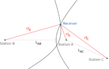 Although usually not formed explicitly in the receiver processing, the conceptual time differences of arrival (TDOAs) define the measurement geometry. Each TDOA corresponds to a hyperboloid of revolution (see Multilateration). The line connecting the two satellites involved (and its extensions) forms the axis of the hyperboloid. The receiver is located at the point where three hyperboloids intersect.[79][80]