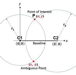 The measured ranges, called pseudoranges, contain clock errors. In a simplified idealization in which the ranges are synchronized, these true ranges represent the radii of spheres, each centered on one of the transmitting satellites. The solution for the position of the receiver is then at the intersection of the surfaces of these spheres; see trilateration (more generally, true-range multilateration). Signals from at minimum three satellites are required, and their three spheres would typically intersect at two points.[168] One of the points is the location of the receiver, and the other moves rapidly in successive measurements and would not usually be on Earth's surface.