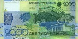 ₸2,000 | green | Abai Opera House, outline map of Kazakhstan with mountain lake in background, value in Russian, name of issuing in Kazakh, logo of issuing bank, inscription in Russian stating that counterfeiting banknotes is against the law | ||