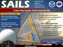 The more angles scanned, the longer between scans at the lowest elevation. Data at that level can be crucial in summer thunderstorm situations when Doppler patterns for rotations and windshifts, as well as dual polarized information, are indicative of severe weather like tornadoes. Shortening the time between two scans at low level is therefore an important factor for convective storm detection. The first step of this program is SAILS (Supplemental Adaptive Intra-Volume Low-Level Scan) which inserts an extra scan of the elevation defined in the VCP definition (normally 0.5°).[2] This is done by forcing the antenna to go back down to the base elevation after scanning a certain number elevations up to the "middle" of the atmosphere, this "middle" elevation being dependent of the VCP used.[2] Doing this provides two low-level scans for each total volume scan while only adding 30 to 35 seconds to the total scan.[2]