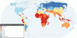 Global concentrations of healthcare resources, as depicted by the number of physicians per 100,000 individuals, by country.