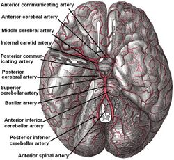 According to Koffler et al., lacunes are derived from an "occlusion of a single deep penetrating artery that arises directly from the constituents of the circle of Willis, cerebellar arteries, and basilar artery". Other lesions that are associated with lacunes appear in the "deep nuclei of the brain (37% putamen, 14% thalamus, and 10% caudate) as well as the pons (16%) or the posterior limb of the internal capsule (10%)". These lesions are less common within other brain regions such as the cerebellum, cerebral white matter and anterior limb of the internal capsule.[9]