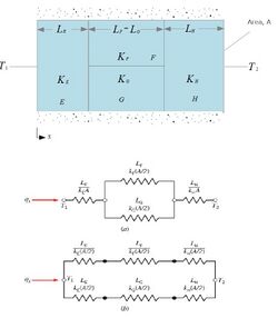 It is often suitable to assume one-dimensional conditions, although the heat flow is multidimensional. Now, two different circuits may be used for this case. For case (a) (shown in picture), we presume isothermal surfaces for those normal to the x- direction, whereas for case (b) we presume adiabatic surfaces parallel to the x- direction. We may obtain different results for the total resistance [math]\displaystyle{ {R_{tot} } }[/math] and the actual corresponding values of the heat transfer are bracketed by [math]\displaystyle{ {q} }[/math]. When the multidimensional effects becomes more significant, these differences are increased with increasing [math]\displaystyle{ {| k_f - k_g |} }[/math].[9]