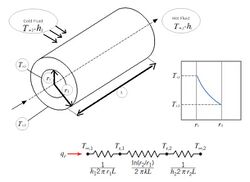 [math]\displaystyle{ { q_r = -kA {dT \over dr} = -k(2\pi rL){dT \over dr}} }[/math] |
