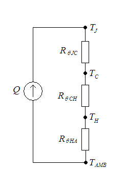 Consider a component such as a silicon transistor that is bolted to the metal frame of a piece of equipment. The transistor's manufacturer will specify parameters in the datasheet called the absolute thermal resistance from junction to case (symbol: [math]\displaystyle{ R_{\theta \rm JC} }[/math]), and the maximum allowable temperature of the semiconductor junction (symbol: [math]\displaystyle{ T_{J\rm max} }[/math]). The specification for the design should include a maximum temperature at which the circuit should function correctly. Finally, the designer should consider how the heat from the transistor will escape to the environment: this might be by convection into the air, with or without the aid of a heat sink, or by conduction through the printed circuit board. For simplicity, let us assume that the designer decides to bolt the transistor to a metal surface (or heat sink) that is guaranteed to be less than [math]\displaystyle{ \Delta T_{\rm HS} }[/math] above the ambient temperature. Note: THS appears to be undefined. Given all this information, the designer can construct a model of the heat flow from the semiconductor junction, where the heat is generated, to the outside world. In our example, the heat has to flow from the junction to the case of the transistor, then from the case to the metalwork. We do not need to consider where the heat goes after that, because we are told that the metalwork will conduct heat fast enough to keep the temperature less than [math]\displaystyle{ \Delta T_{\rm HS} }[/math] above ambient: this is all we need to know. Suppose the engineer wishes to know how much power can be put into the transistor before it overheats. The calculations are as follows.