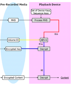 The Media key is combined with the VID (Volume ID) and as a result we obtain the Volume Unique Key ([math]\displaystyle{ K_{vu} }[/math]). With the [math]\displaystyle{ K_{vu} }[/math] we are able to decrypt the Encrypted Title Key and obtain the Title keys which finally allows to decrypt the content of the disc and view it.[2]