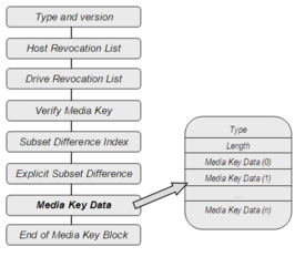 Even though it seems a simple mechanism the MKB key which is found in the physical support of the disc follows a complex structure. The MKB is distributed in blocks that contain the version of the Media key, the list of devices that have been revoked, a field to authenticate the MKB, and other fields that specify parameters corresponding to the decrypting algorithm and define the structure of the own Media Key and also the Media key itself.