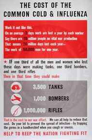 The economic impact of the common cold is not well understood in much of the world.[92] In the United States, the common cold leads to 75–100 million physician visits annually at a conservative cost estimate of $7.7 billion per year. Americans spend $2.9 billion on over-the-counter drugs and another $400 million on prescription medicines for symptom relief.[107] More than one-third of people who saw a doctor received an antibiotic prescription, which has implications for antibiotic resistance.[107] An estimated 22–189 million school days are missed annually due to a cold. As a result, parents missed 126 million workdays to stay home to care for their children. When added to the 150 million workdays missed by employees who have a cold, the total economic impact of cold-related work loss exceeds $20 billion per year.[55][107] This accounts for 40% of time lost from work in the United States.[108]