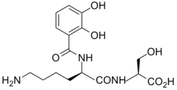 Siderophores are also important for some pathogenic bacteria for their acquisition of iron.[3][4][10] In mammalian hosts, iron is tightly bound to proteins such as hemoglobin, transferrin, lactoferrin and ferritin. The strict homeostasis of iron leads to a free concentration of about 10−24 mol L−1,[11] hence there are great evolutionary pressures put on pathogenic bacteria to obtain this metal. For example, the anthrax pathogen Bacillus anthracis releases two siderophores, bacillibactin and petrobactin, to scavenge ferric ion from iron containing proteins. While bacillibactin has been shown to bind to the immune system protein siderocalin,[12] petrobactin is assumed to evade the immune system and has been shown to be important for virulence in mice.[13]