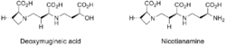 Although there is sufficient iron in most soils for plant growth, plant iron deficiency is a problem in calcareous soil, due to the low solubility of iron(III) hydroxide. Calcareous soil accounts for 30% of the world's farmland. Under such conditions graminaceous plants (grasses, cereals and rice) secrete phytosiderophores into the soil,[23] a typical example being deoxymugineic acid. Phytosiderophores have a different structure to those of fungal and bacterial siderophores having two α-aminocarboxylate binding centres, together with a single α-hydroxycarboxylate unit. This latter bidentate function provides phytosiderophores with a high selectivity for iron(III). When grown in an iron -deficient soil, roots of graminaceous plants secrete siderophores into the rhizosphere. On scavenging iron(III) the iron–phytosiderophore complex is transported across the cytoplasmic membrane using a proton symport mechanism.[24] The iron(III) complex is then reduced to iron(II) and the iron is transferred to nicotianamine, which although very similar to the phytosiderophores is selective for iron(II) and is not secreted by the roots.[25] Nicotianamine translocates iron in phloem to all plant parts.