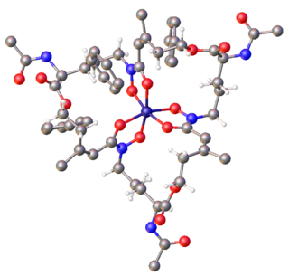Siderophores usually form a stable, hexadentate, octahedral complex preferentially with Fe3+ compared to other naturally occurring abundant metal ions, although if there are fewer than six donor atoms water can also coordinate. The most effective siderophores are those that have three bidentate ligands per molecule, forming a hexadentate complex and causing a smaller entropic change than that caused by chelating a single ferric ion with separate ligands.[16] Fe3+ is a strong Lewis acid, preferring strong Lewis bases such as anionic or neutral oxygen atoms to coordinate with. Microbes usually release the iron from the siderophore by reduction to Fe2+ which has little affinity to these ligands.[8][2]