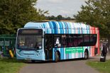 Warming stripes on a bus in Reading, Berkshire, U.K.