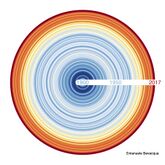 Average global temperature are depicted with chronologically ordered, concentric coloured rings.[13]