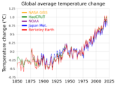 ↑ 3.03.13.23.3Typically, warming stripe graphics portray temperature anomalies—usually, deviations from an average temperature over a chosen reference period (baseline)—and not absolute temperatures. Also, different graphics' colours may cover different-size temperature ranges (e.g., 0.10 °C per colour vs. 0.15 °C per colour). Accordingly, a particular colour in one graphic does not necessarily represent the same absolute temperature or temperature anomaly as the same colour in another graphic.