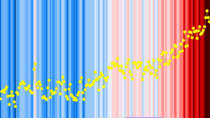 This composite of a conventional line graph superimposed on a warming stripe graphic illustrates year-by-year correlation of data points and coloured stripes.[19]