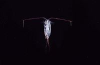 Copepods. Copepods are small crustaceans, most about 1-2 millimeters long with some larger. They are unusual among animals in only having one eye. Most species feed on the single-celled phytoplankton and are in turn eaten by fish and other larger animals.