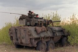 The AVGP variants were introduced into Canadian service in the late 1970s.[4] Intended for use only in Canada , they were pressed into service for several United Nations missions, including UNPROFOR and the mission to Somalia. One Grizzly was captured by Serb forces in the late 1990s, despite it being present on a peace keeping mission.[9]