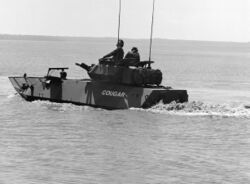 The Cougar was used for training in Canada as an armoured fighting vehicle and informally labelled a "tank trainer".[5] During the 1980s and 1990s, it was used by armoured units as a fire support vehicle, for those units not equipped with the Leopard tank. The squadrons equipped with the Cougar in those regiments were humorously referred to as the "boat squadron" as opposed to the reconnaissance squadrons, which were equipped with the Lynx, and later the Coyote (another AVGP successor).