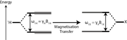 In this technique the natural nuclear polarization of an abundant spin (typically 1H) is exploited to increase the polarization of a rare spin (such as 13C, 15N, 31P) by irradiating the sample with radio waves at the frequencies matching the Hartmann–Hahn condition:[3]