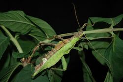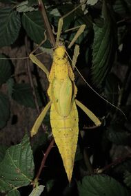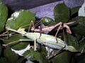 The females are much larger and wider than the males, reaching 14 centimetres (5.5 in) to 17 centimetres (6.7 in) in length[3] and 30 to 65 g in weight, making them among the heaviest phasmids and extant insects.[4] In addition to the typically lime green-colored females, there are also yellow and even more rarely red-brown females. Their two pairs of wings are both shortened. At rest, the green forewings, formed as tegmina, cover the somewhat shorter, strikingly pink-colored membranous hind wings, here formed as alae, however they are incapable of flight. The head, body and legs are thorny. The flattened body is provided with a number of spines, in particular along the body edges including the abdomen and the legs, and especially along the hind legs. At the end of the abdomen there is a secondary ovipositor for laying the eggs in the ground. It surrounds the actual ovipositor and is ventral formed from the eighth sternite, here named subgenital plate[5] or operculum and dorsally from the eleventh tergum, which is referred to here as the supraanal plate or epiproct.[6]